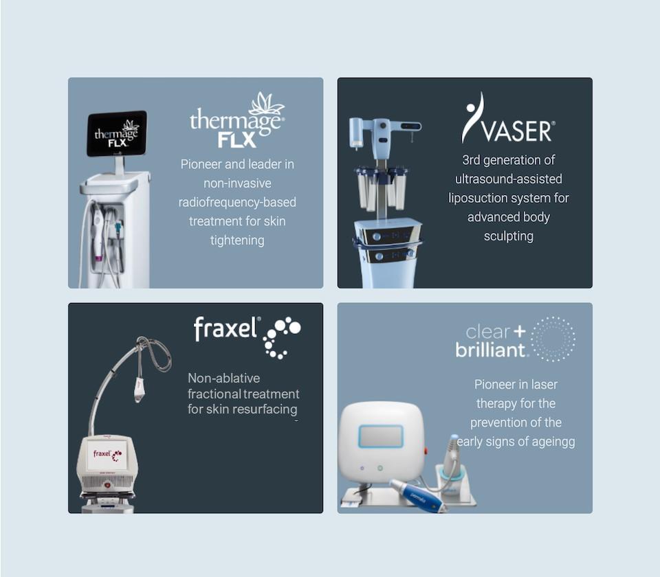 Our Thermage®, Clear + Brilliant®, Fraxel®, and VASER® systems offer advanced non-invasive and minimally invasive skin treatments such as skin tightening, skin resurfacing, skin ageing prevention, and body contouring.